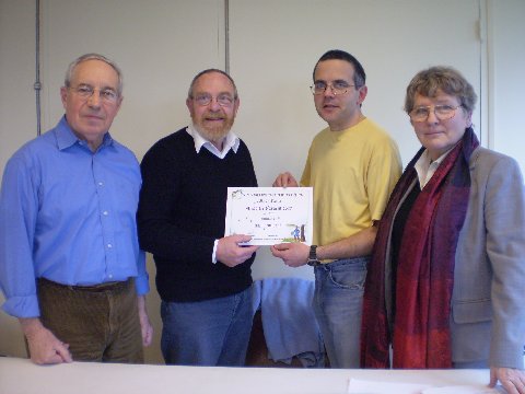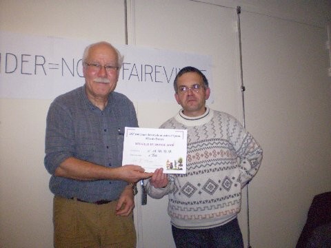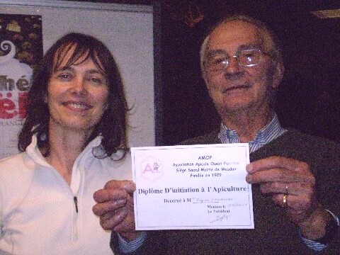 Lors de l'Assemblée Générale du 29 Novembre 2008, Frank C*****, notre Vice-Président et responsable des cours au rucher école de Chaville, remettait à Régine C******* et Loïc B******, notre diplôme d'initiation à l'apiculture, félicitations à ces apiculteurs très motivés. Souhaitons la création d'une amicale avec la promotion 2009.Bien entendu nous les accueillons dans nos ruchers communs afin que les anciens les encadrent dans l'évolution de leurs connaissances.
