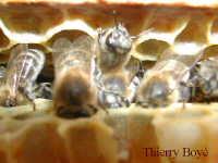 La vie intérieur de la ruche, entre 2 cadres, les ouvrières d'intérieur s'activent,à leurs tâches, la tête plongée dans les alvéoles (pour le nettoyage, le nourrisage des larves, l'accumulation de provisions,...)